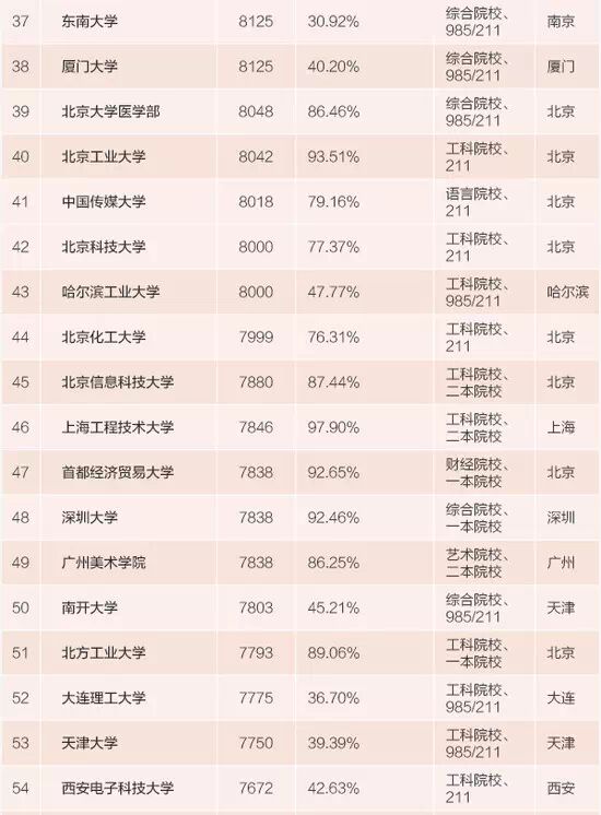 除了一線城市,其余上榜的32所大學(xué)所在地城市有南京(5所)、杭州(4所)、天津(3所)、西安(3所)、武漢(2所)、成都(2所)、大連(2所)、哈爾濱(2所)、長沙(2所)、合肥(1所)、重慶(1所)、廈門(1所)、汕頭(1所)、南昌(1所)、長春(1所)和張家口(1所)。除了河北建筑工程學(xué)院這個(gè)特殊樣本外,這32所大學(xué)絕大部分為985/211大學(xué)。說明如果比拼不了讀書的城市,所讀大學(xué)本身的985牌子才是拿高薪的硬道理。