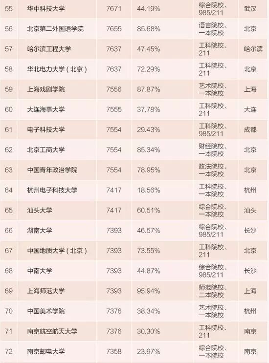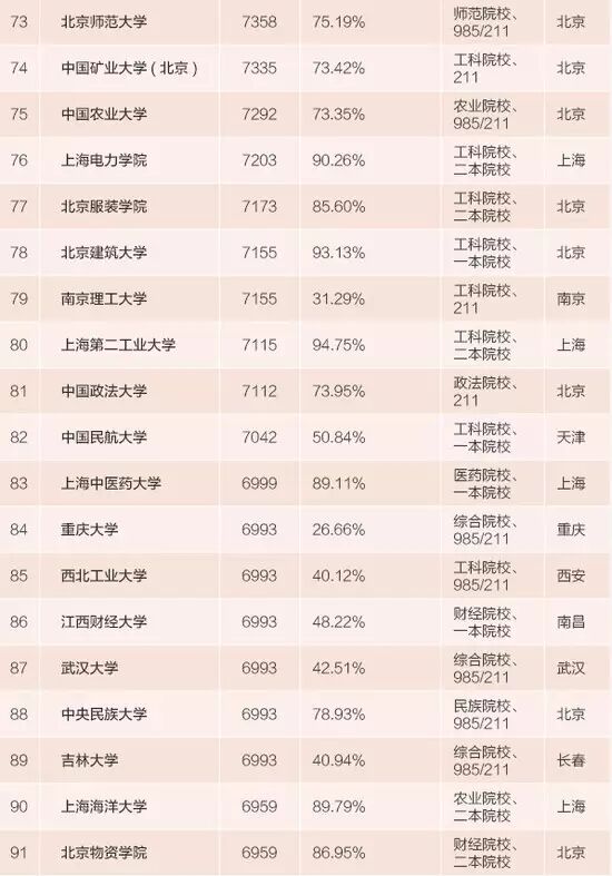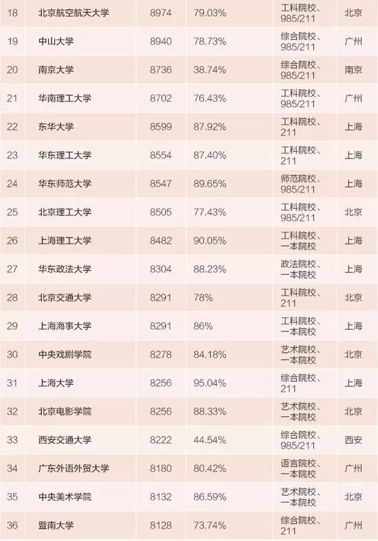 實(shí)在不行,要想高薪還能靠所學(xué)專業(yè)取勝。上榜的100強(qiáng)大學(xué)中,除卻大學(xué)所在地和大學(xué)的級(jí)別類型,工科、財(cái)經(jīng)、語言、藝術(shù)等專業(yè)性傳統(tǒng)強(qiáng)校也是想畢業(yè)后拿高薪報(bào)考大學(xué)選擇的重點(diǎn)之一。100強(qiáng)中,有11所財(cái)經(jīng)院校、7所語言院校、5所藝術(shù)院校,這些專業(yè)性傳統(tǒng)強(qiáng)校中絕大部分并非985或211大學(xué),但都屬于這個(gè)學(xué)科中的佼佼者。