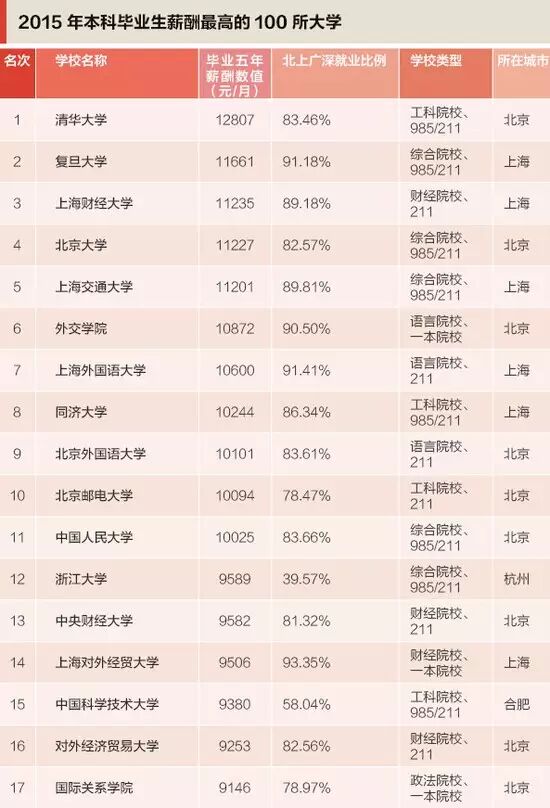 上榜的100所院校中,只有14所為二本院校!這意味著要想未來薪酬高,在報(bào)考大學(xué)時(shí)依然要選擇一本以上的大學(xué),尤其是211工程院校和985工程院校。百強(qiáng)榜中的前十名為清華大學(xué)、復(fù)旦大學(xué)、上海財(cái)經(jīng)大學(xué)、北京大學(xué)、上海交通大學(xué)、外交學(xué)院、上海外國語大學(xué)、同濟(jì)大學(xué)、北京外國語大學(xué)、北京郵電大學(xué)。這些都是響當(dāng)當(dāng)?shù)闹袊!?/p>