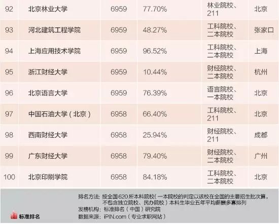 共有20個(gè)城市的100所大學(xué)上榜,68所大學(xué)位于北上廣深等一線城市,其中北京高校有40所,上海高校有21所,廣州為6所,深圳為1所。從進(jìn)入100強(qiáng)的14所二本院校所在地來看,除了河北建筑工程學(xué)院和浙江財(cái)經(jīng)大學(xué)外,也都位于北上廣深等一線城市。即便是這兩所院校,從就業(yè)地來看,也都集中在北京、杭州這樣的高薪城市。